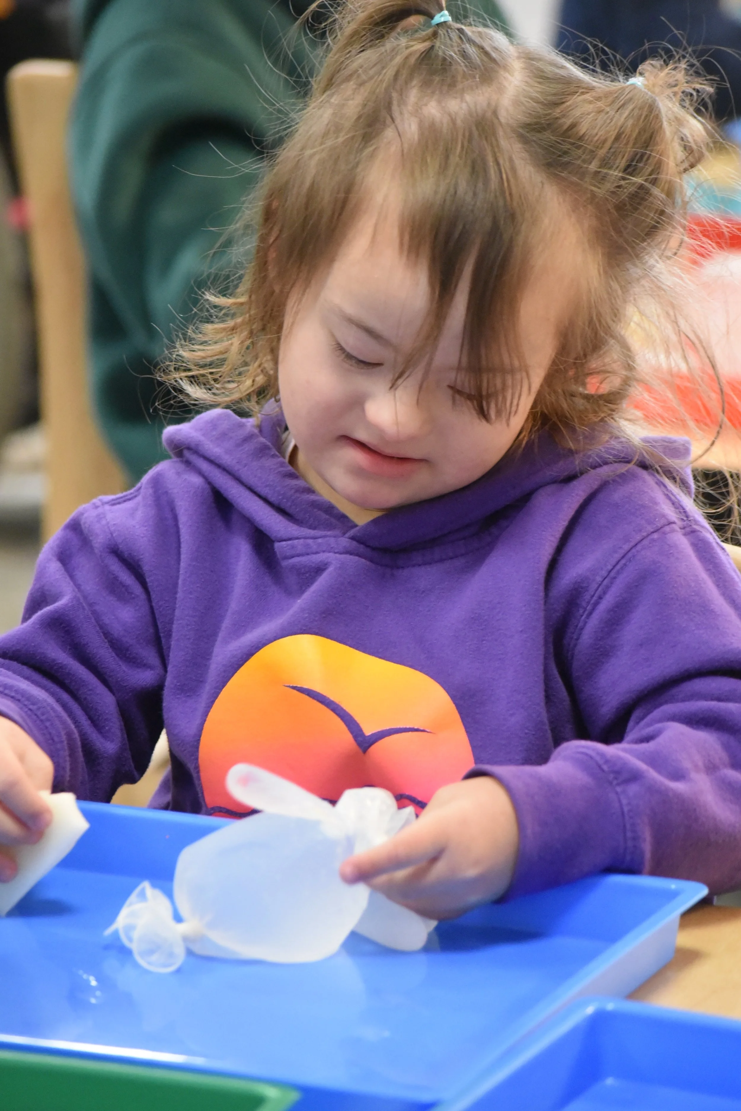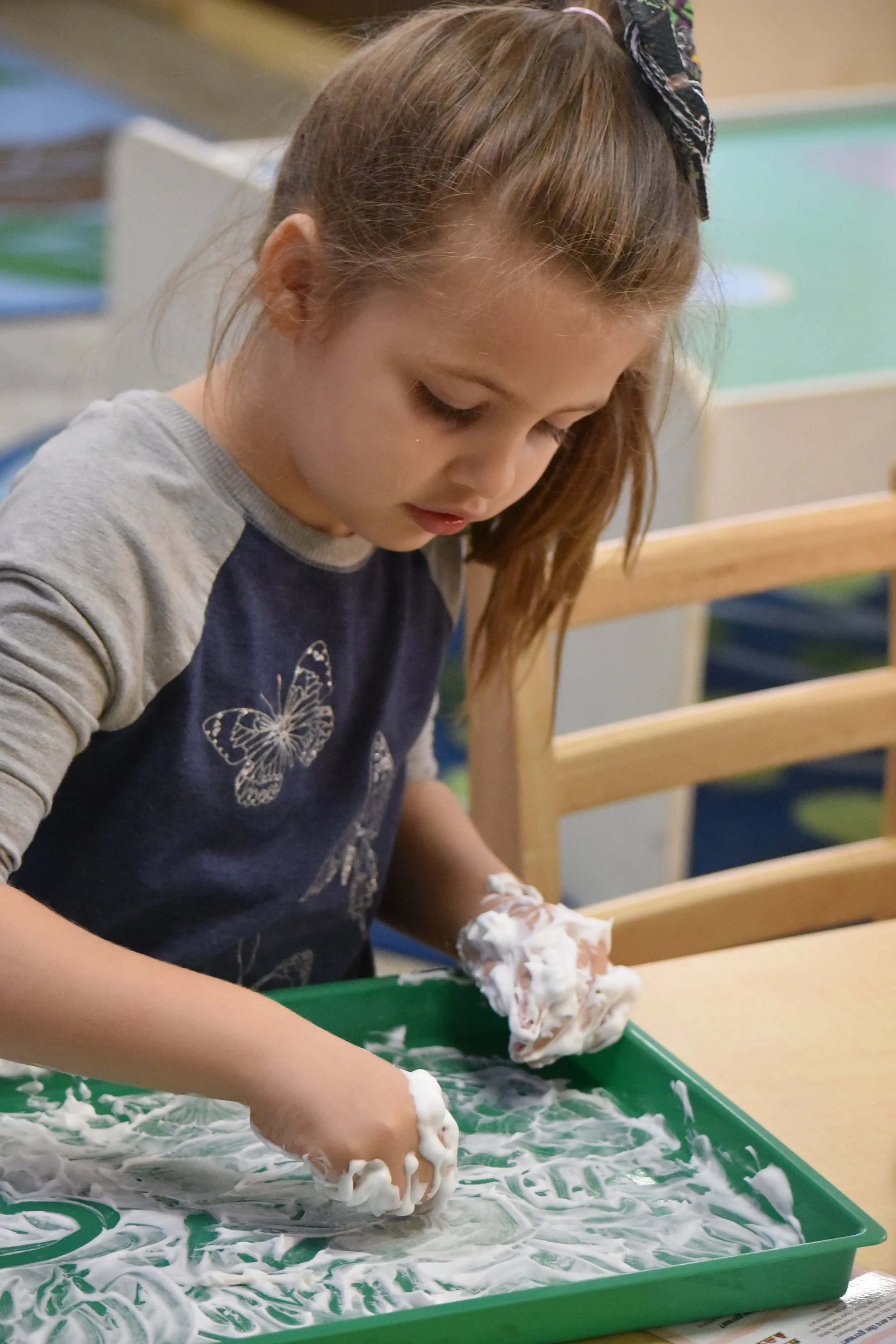 Literacy shows up in meaningful ways; writing names, labeling artwork, dictating stories, journaling